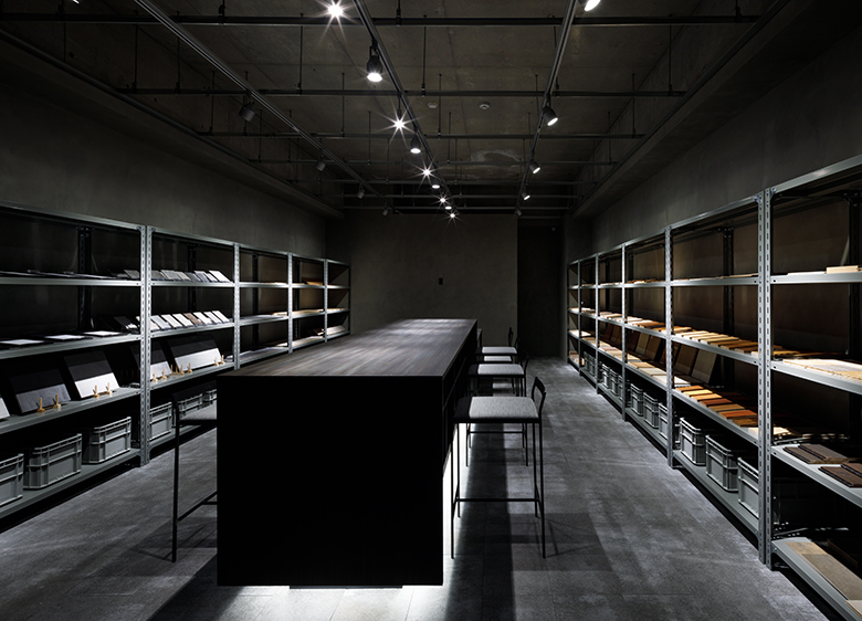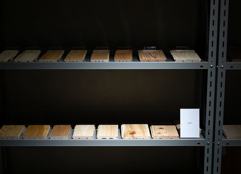 新潟オフィスに併設されたショールーム「材室」では、県内ではなかなか見られないような国産の木材、壁やタイルといった内装材を展示しています。