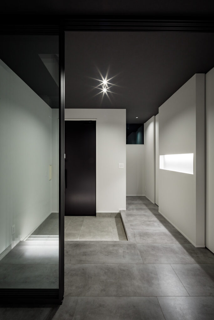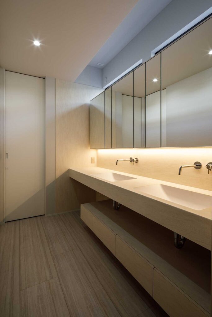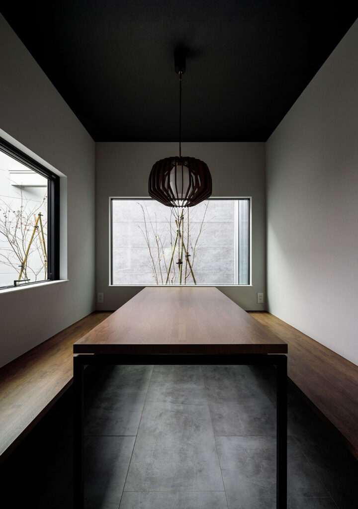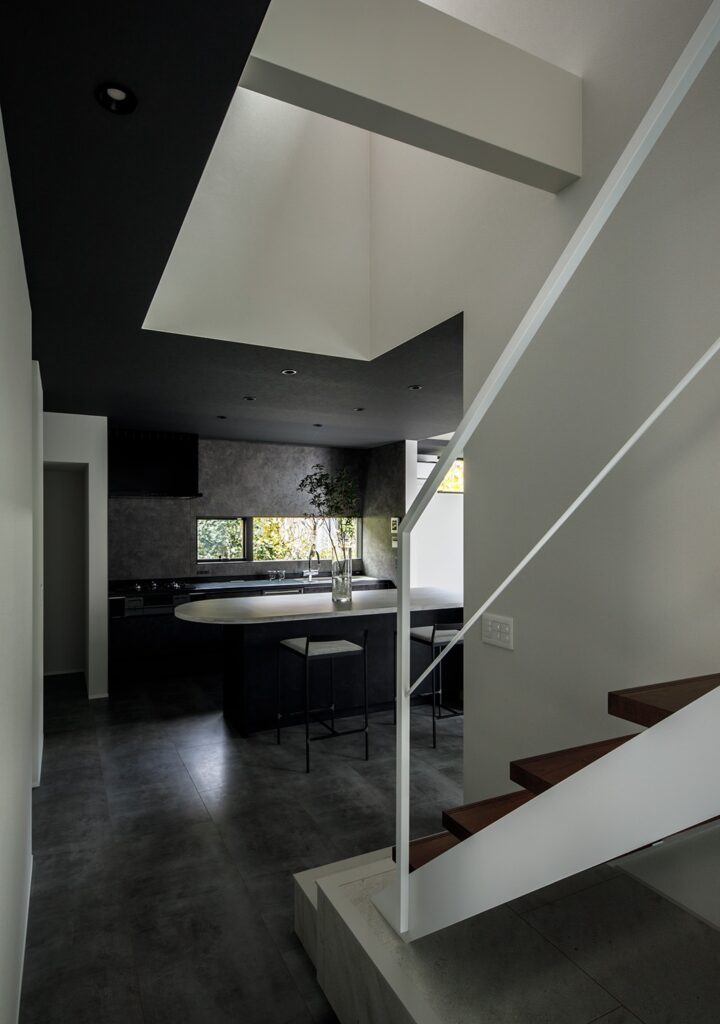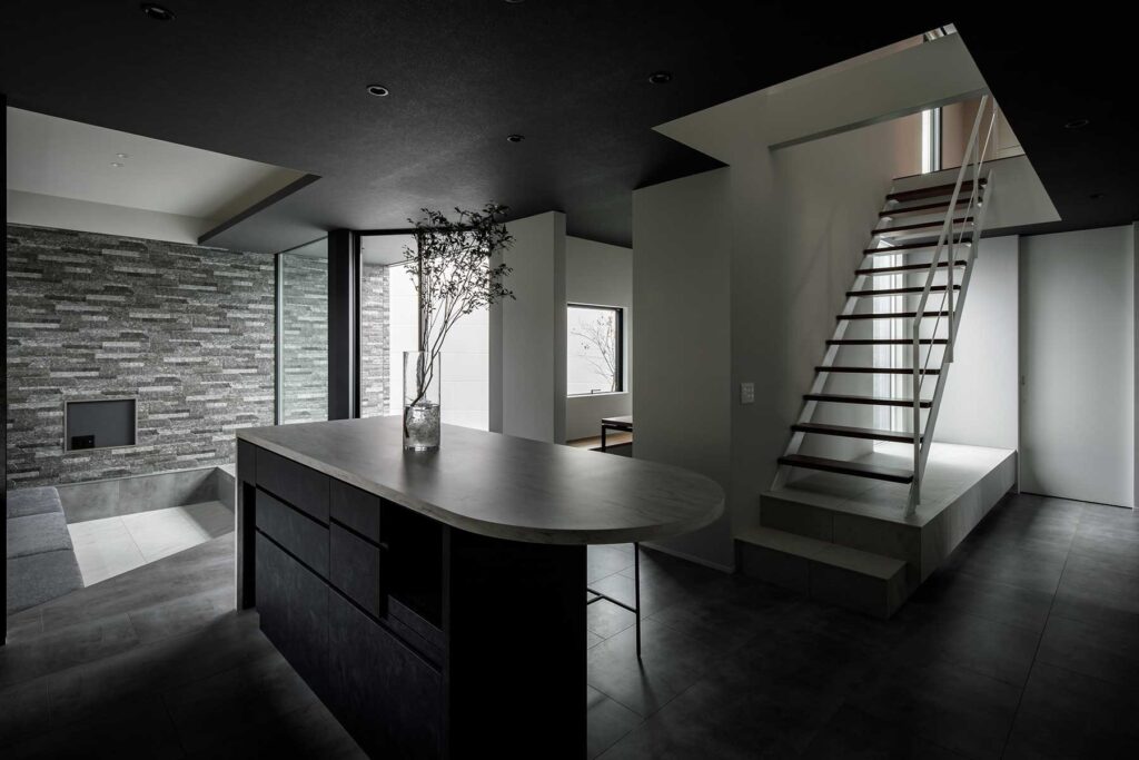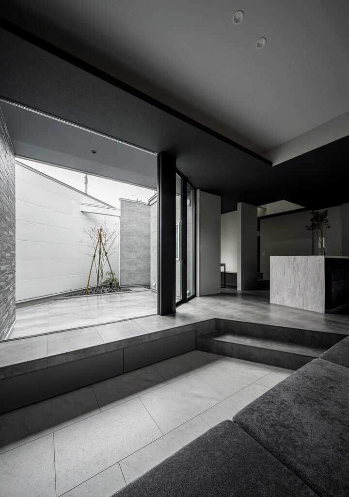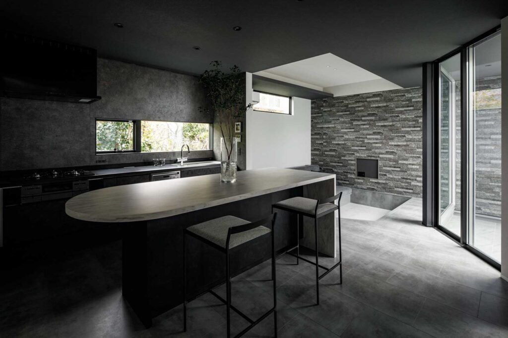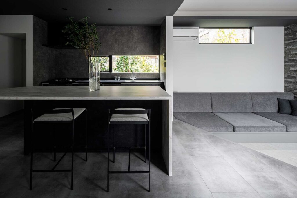 プライバシーを確保しながら開放感を得られる設計とし、外からの視線を気にすることがないカーテンレスの住空間、自然光を取り込みながら、家族それぞれがリラックスして過ごせるスペースを実現しました。リビングからは中庭を望み、緑ある風景と、浴室からも植栽を眺めながら、贅沢に疲れを回復するひとときを過ごせます。空間は一体感がありながら、家族が別々に過ごしていても自然と気配を感じられる空間構成。また、家事がスムーズに進む回遊動線や集中型収納を配し、バスや洗面とクローゼットとパントリーを隣接させることで、日々の暮らしの動線をより快適に過ごせる住まいとなりました。