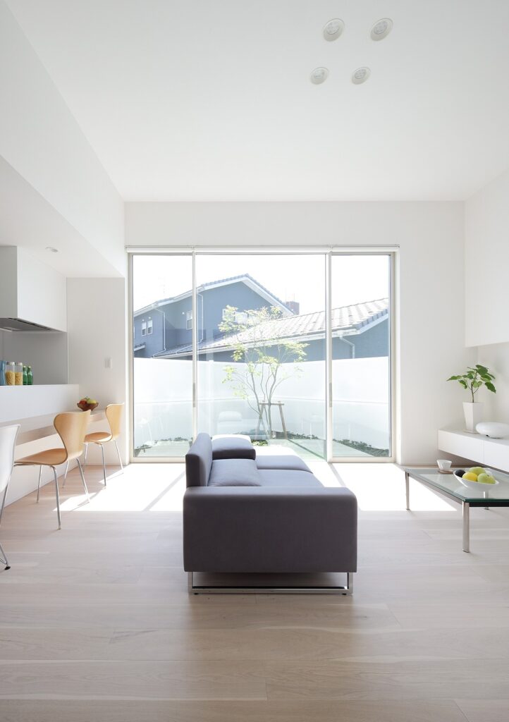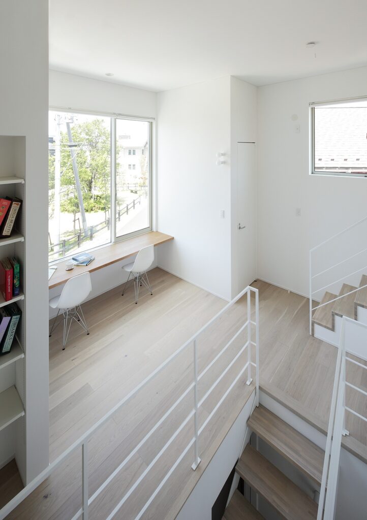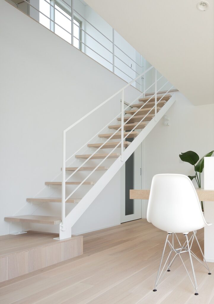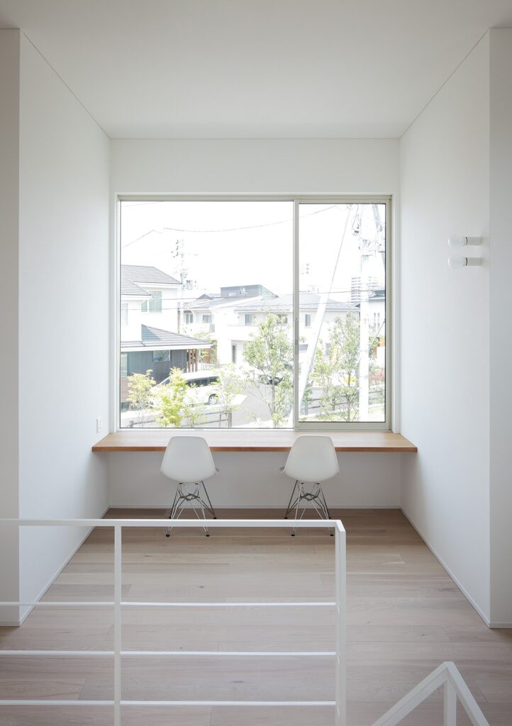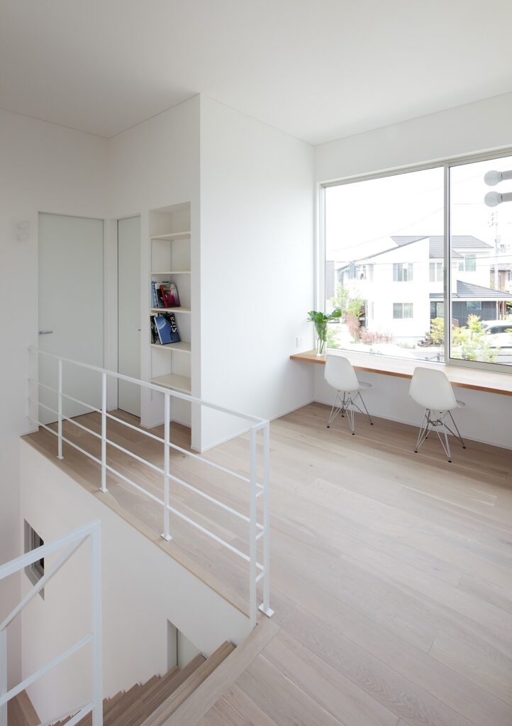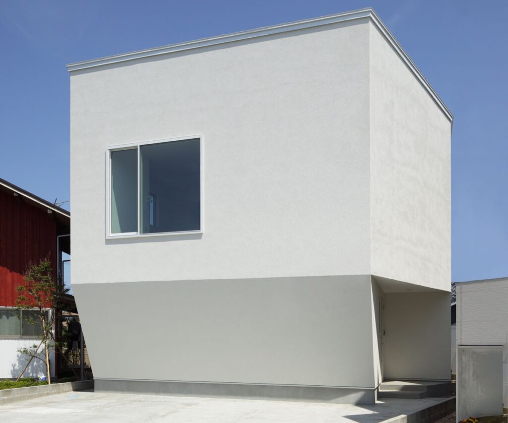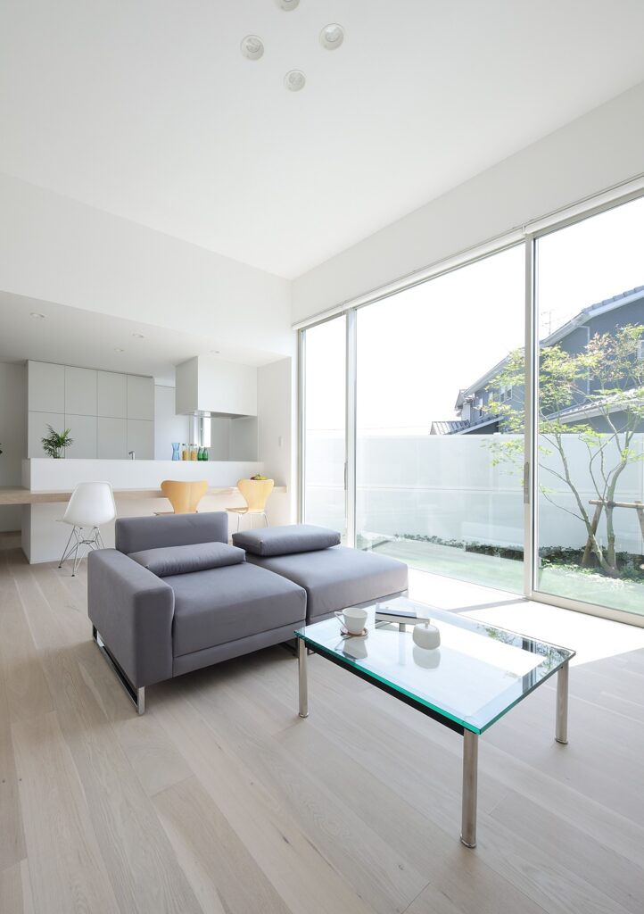 大きな窓が目立つ白い外観の住宅。シャープな形の外観ですが、左官仕上げの外壁がどこか柔らかく印象付けています。裏には綺麗な芝を敷いた庭があり、リビングから見渡せます。