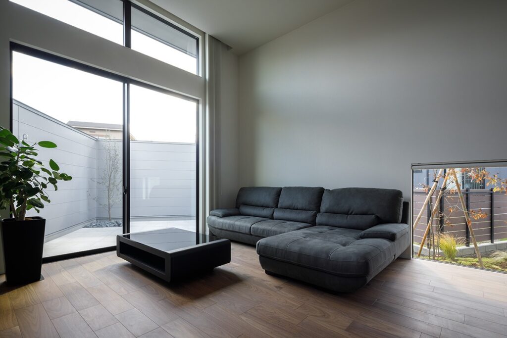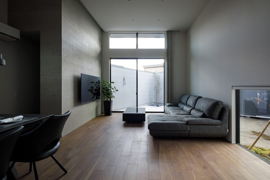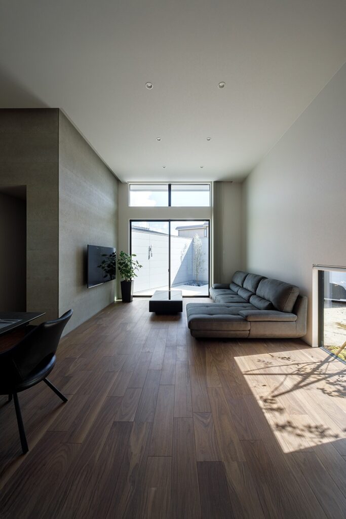 一見窓のない外観から室内に入ると、天井高3.5mの大空間のリビングが広がり、