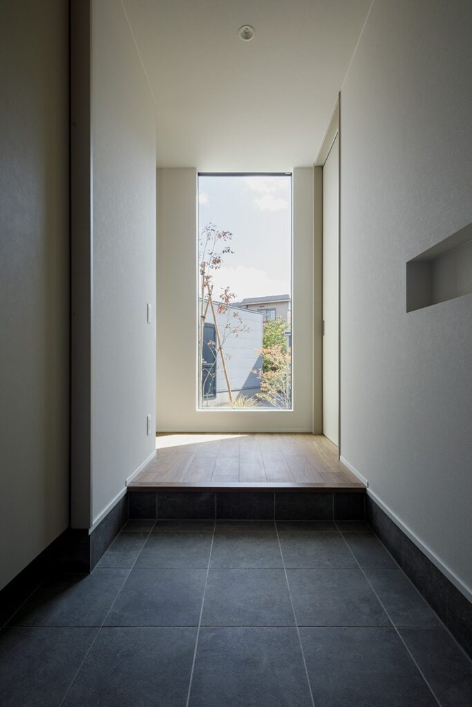 その先の大きな窓からは、土地の形状に沿って形作られた特徴ある中庭があり、室内に開放感と光をもたらしています。